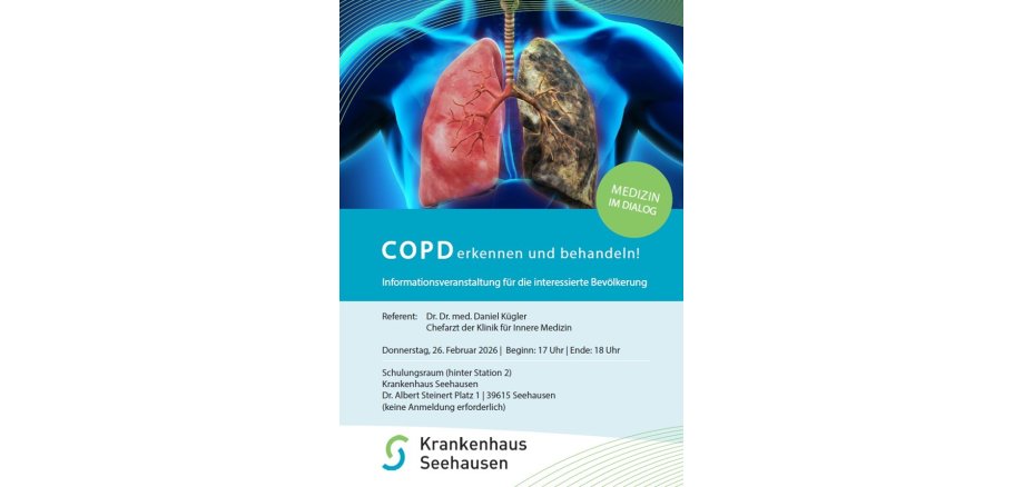 The first lecture in 2026 deals with the topic "Lung disease COPD - recognizing and treating". The speaker will be Dr. Dr. med. Daniel Kügler, Head Physician of the Internal Medicine Clinic. The event will take place in the training rooms behind ward 2 and is open to everyone.
