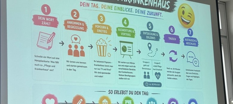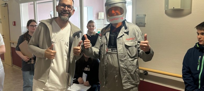 Practice supervisor Benny Friedrichs prepared the day and, together with Kristin Kirschke, also a practice supervisor, took the children on an adventure tour through everyday hospital life. After getting to know each other, there was a lot of information about everyday hospital life and the individual departments. After that, the theory, which was sweetened with popcorn in the style of a movie, came to an end and we went on an adventure tour in two groups. The first group looked at individual areas and professional groups. One station, for example, was the laboratory with exciting insights. The cleaning staff also presented their professional group and made it clear that every profession in the hospital is important and contributes to the smooth running of the hospital. The second group concentrated fully on nursing, which was shown live and up close. The children were able to try out an old people's suit and simulate how difficult everyday life is for elderly people and people suffering from dementia. They then had to find their way around a darkroom wearing the suit and experience certain situations, which was not always easy. But what steps are needed to move a patient and how do I get a slider under the patient if they can't get up? Here, too, there were active answers. After an hour, the groups were swapped so that all students could get a taste of all areas. At the end, the impressions were evaluated and questions that had arisen were answered.