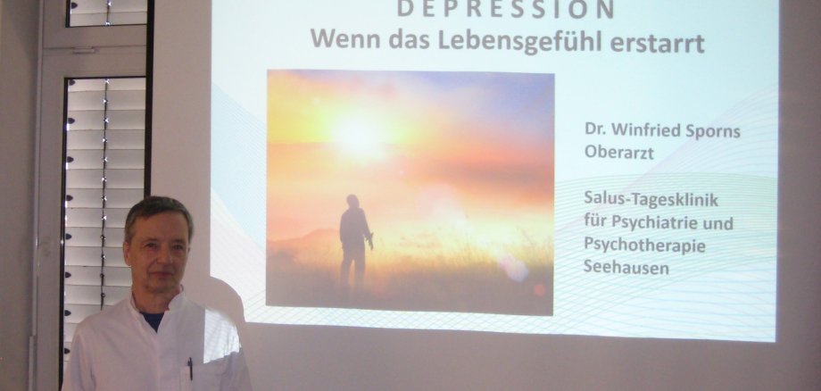 Dr. Winfried Sporns, Leiter der Salus-Tagesklinik für Psychiatrie und Psychotherapie im Krankenhaus Seehausen, gab viel Wissenswertes über den Begriff Depression weiter, über die 3 Hauptsymptome dieser Erkrankung, über zusätzliche Symptome, die noch typisch sind, sowie über Schweregrade. Anhand eines Modells erläuterte er die Entstehung von Depressionen. Auch auf die allgemeinen Gesichtspunkte der Behandlung ging er ein. Wirksame Medikamente gibt es seit 1957, die das Leben mit einer Depression oder depressiven Verstimmungen bedeutend erleichtern. Es ist allerdings nicht immer eine medikamentöse Behandlung nötig, so Sporns. Eine Behandlung in der Salus-Tagesklinik in Seehausen ist eine Möglichkeit der Therapie von Depressionen. Die Tagesklinik besteht seit 2010 im Seehäuser Krankenhaus. Hier werden Patientinnen und Patienten mit depressiven Erkrankungen und Angststörungen behandelt. Die Behandlung erfolgt innerhalb von Gruppentherapien, Einzeltherapien sowie allgemeinen Therapien, wie z.B. Ergotherapie. Wichtig ist für die Patientinnen und Patienten auch der Austausch untereinander. Es werden 16 Therapieplätze vorgehalten, wobei es hier Wartezeiten von ca. 3 bis 6 Wochen gibt. Die Behandlung dauert dann zwischen 6 und 8 Wochen. Allerdings ist eine Behandlung in der Tagesklinik bei einer bestehenden Suchterkrankung (wie Alkohol oder Drogen) nicht möglich.